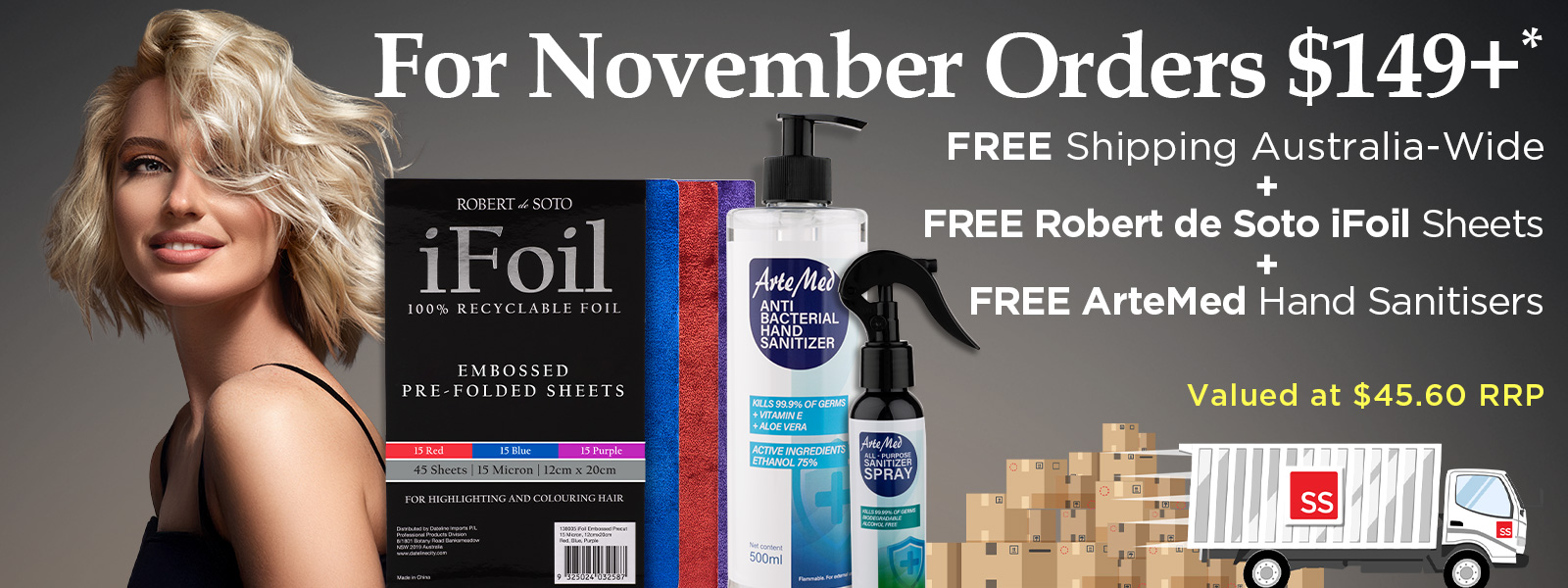 *Free shipping, 1 x Robert de Soto iFoil Coloured Embossed Sheets 45pc, 1 x ArteMed Hand Sanitiser 500mL & 1 x ArteMed Sanitiser Spray 120mL on orders $149+. Valued at $45.60 RRP. No code needed. Items automatically added to eligible orders. Valid November 2025 or whilst stocks last. No rainchecks. Salon Saver reserves the right to change or rescind this offer at any time.