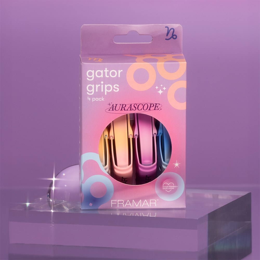 It’s written in the stars! Embrace heavenly shades with Aurascope. Framar Gator Grip Clips 4 Pack Aurascope effortlessly hold large sections of hair. With a wide mouth and rubberised non-slip surface, these clips are stronger than an alligator. Secures hair during colouring, styling and foiling. Industrial springs for ultimate durability. Pack of four.
