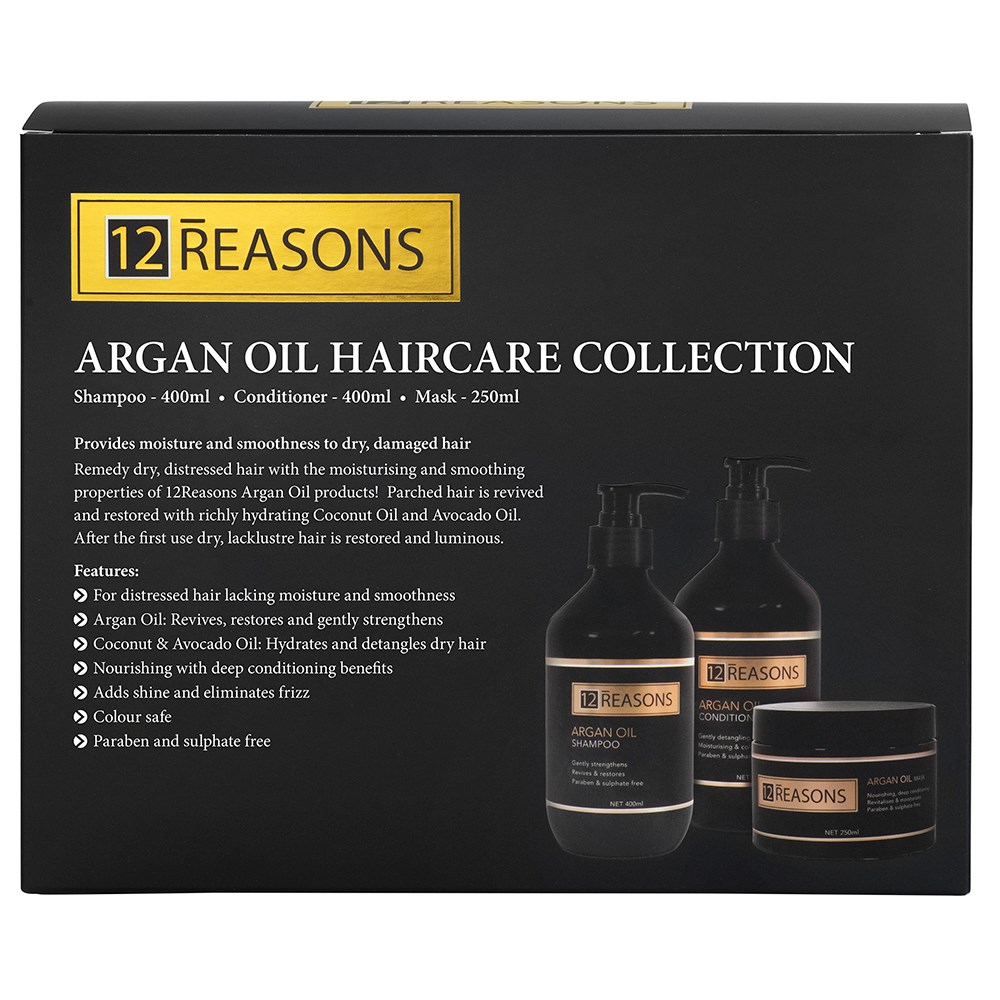 To Use: Apply 12Reasons Argan Oil Shampoo liberally to wet hair. Lather. Rinse. Follow with 12Reasons Argan Oil Hair Treatment Mask by applying liberally from mid-shaft to ends. Let process for 7-10 minutes. Rinse. Finish with 12Reasons Argan Oil Conditioner by applying to mid-lengths and ends. Condition. Rinse.