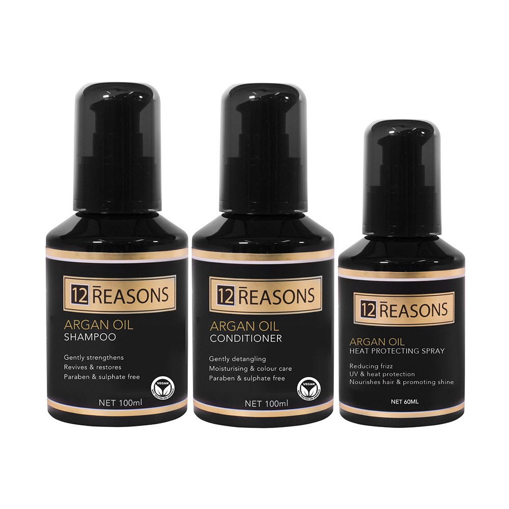 12Reasons Argan Oil Travel Pack makes travel absolutely gorgeous with three travel-sized products. Restore radiance and renew vitality while hydrating. Frizz is wonderfully tamed. Dry, lifeless hair is transformed, shining with luminosity. Powered by argan, coconut and avocado oils for the best of nature. Free from parabens and sulphates. Colour-safe. Designed and formulated in Australia.