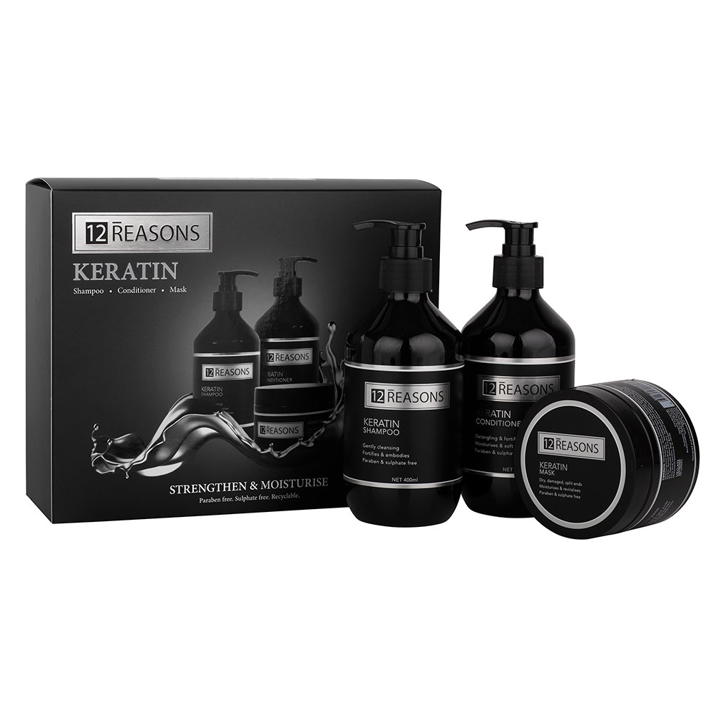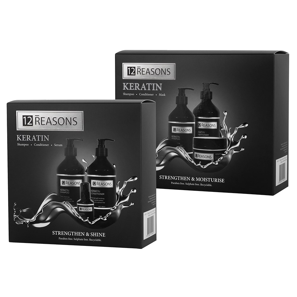 Hydrate and protect damaged hair with 12Reasons Keratin Moisturise Sale Pack ! Hydrolysed Keratin is rich in amino acids, which help to improve the strength of hair and protect from chemical and heat styling damage. Moisturising Macadamia Oil offers extra hydration to leave hair feeling softer and more vibrant. Vegan and not tested on animals. Sulphate and paraben free, colour safe and ideal for all hair types.