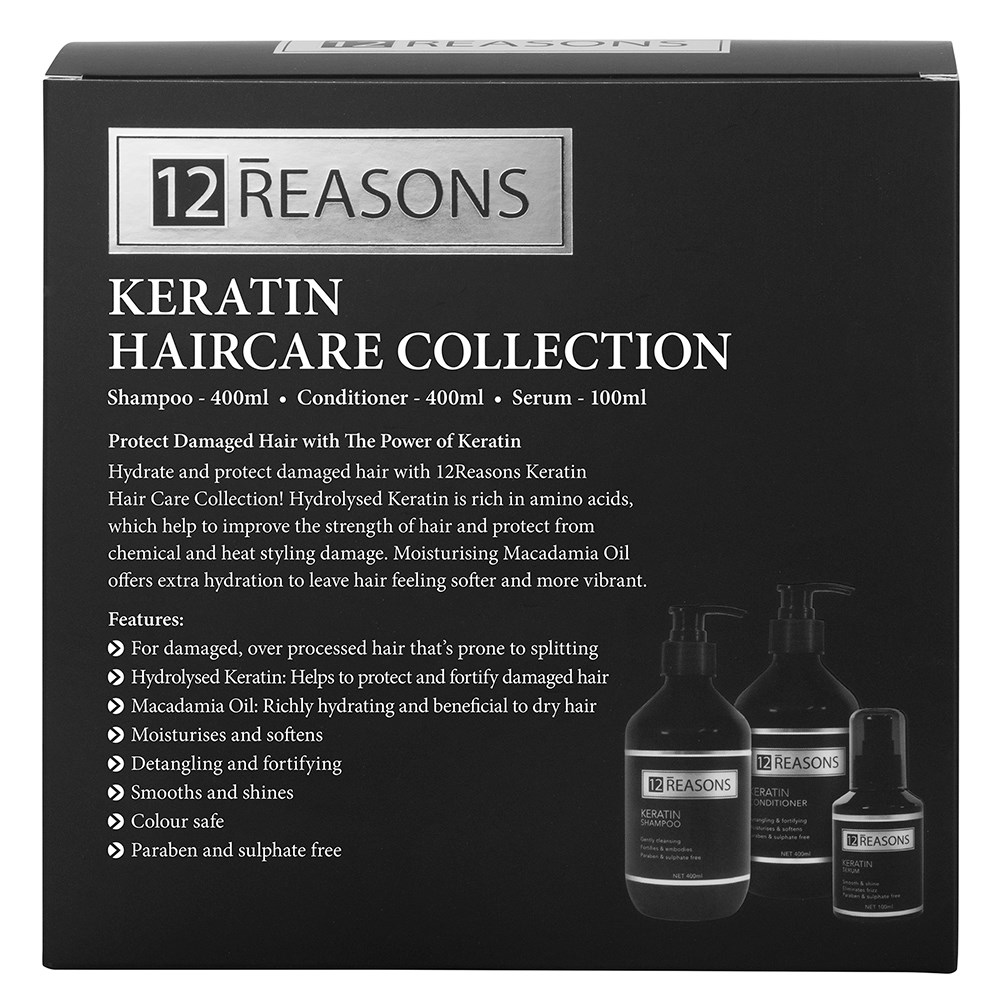 To Use: Apply 12Reasons Keratin Shampoo liberally to wet hair. Lather. Rinse. Follow with 12Reasons Keratin Conditioner by applying to mid-lengths and ends. Condition. Rinse. Finish with 12Reasons Keratin Hair Serum by applying a small amount of serum to clean, damp, or dry hair. Style as desired.