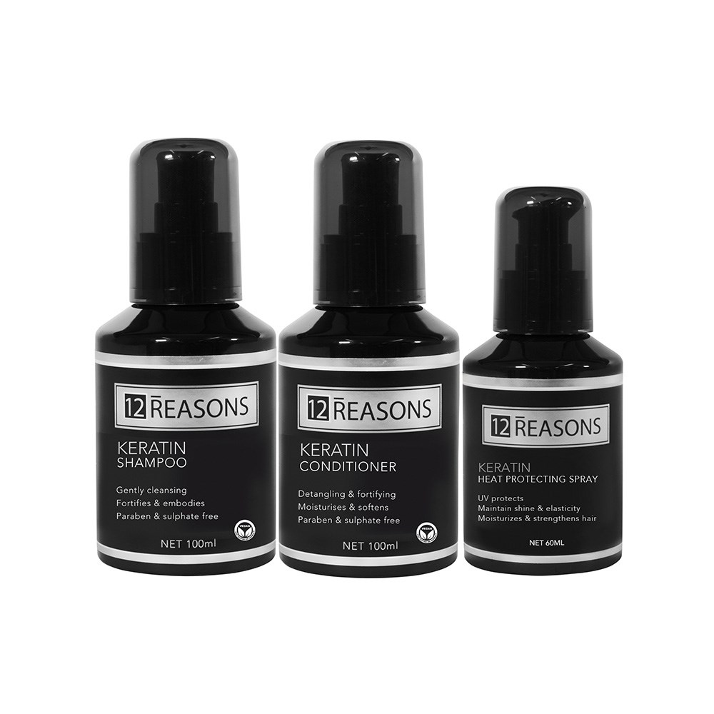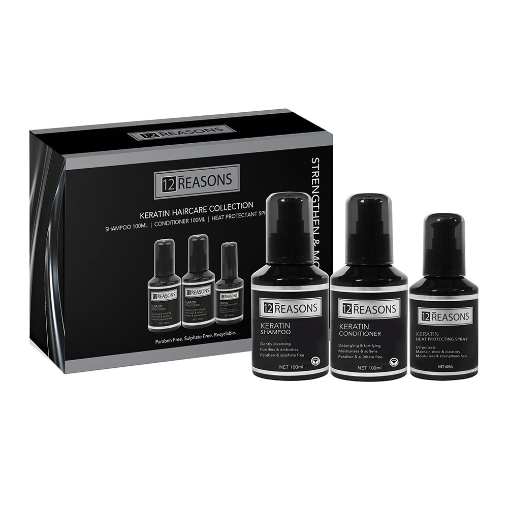12Reasons Keratin Travel Pack makes travel absolutely gorgeous with three travel-sized products. Restore strength and renew shine while boosting nourishment. Hair is left fortified and repaired. Dry, damaged hair is transformed, shining with strength. Powered by keratin, macadamia oil and avocado oil for the best of nature. Free from parabens and sulphates. Colour-safe. Vegan. Not tested on animals. Designed and formulated in Australia.