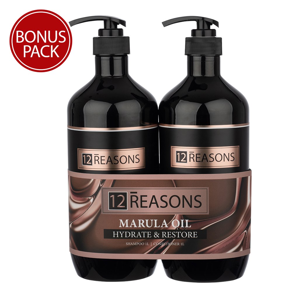 Ideal for unmanageable, frizzy hair. Cleanse, nourish and kick frizz to the kerb with the 12Reasons Marula Oil Duo 1 Litre Sale Pack. Fruit and Seed Oils add softness and shine, taming unmanageable hair by intensely moisturising to smooth frizz. Fly-aways are a thing of the past with 12Reasons Marula Oil haircare.