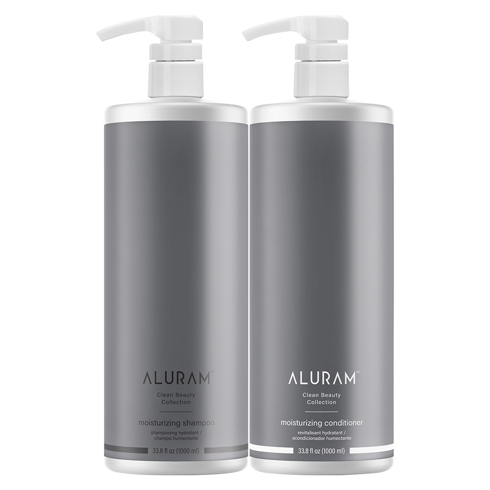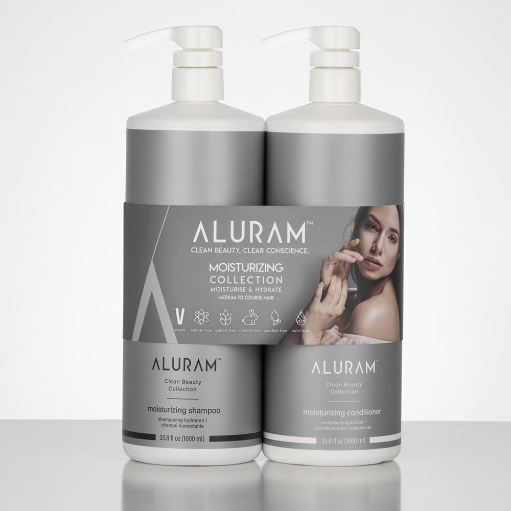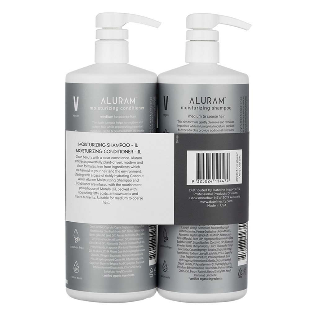 Clean beauty with a clear conscience. The Aluram Moisturising Haircare Duo 1 Litre Sale Pack offers a powerfully plant-driven formulation started in a base of hydration-rich Coconut Water and infused with Marula Oil to create the most effective moisturising duo. Vegan, sulphate free, gluten free, paraben free, silicone free and colour safe. Made in the USA. For medium to coarse hair.