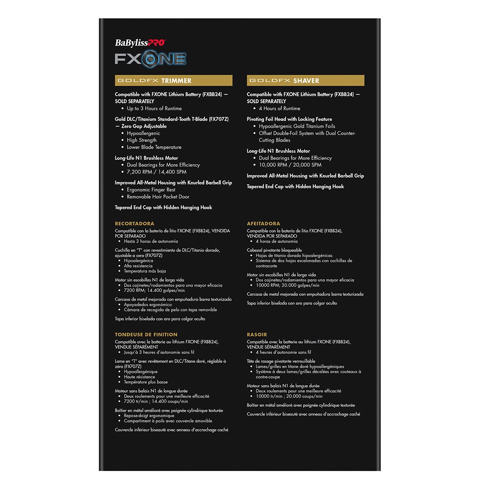 BaBylissPRO FXOne GoldFX Trimmer and Shaver Duo doubles the performance, convenience and innovation. Part of the FXONE universe based on only one battery, this duo will change the way you work. BaByliss PRO FXONE GoldFX Trimmer harnesses a long-life 7,200 rpm N1 brushless motor. Gold DLC/titanium standard-tooth T-blade is high strength and zero gap adjustable. Three hours cordless runtime. BaBylissPRO FX ONE GoldFX Shaver has a pivoting foil head with locking mechanism. Long-life 10,000 rpm N1 brushless motor. Hypoallergenic gold titanium foils for a smooth, ultra-close cut. Offset double-foil system. Four hours cordless runtime. Both tools feature all-metal housing.