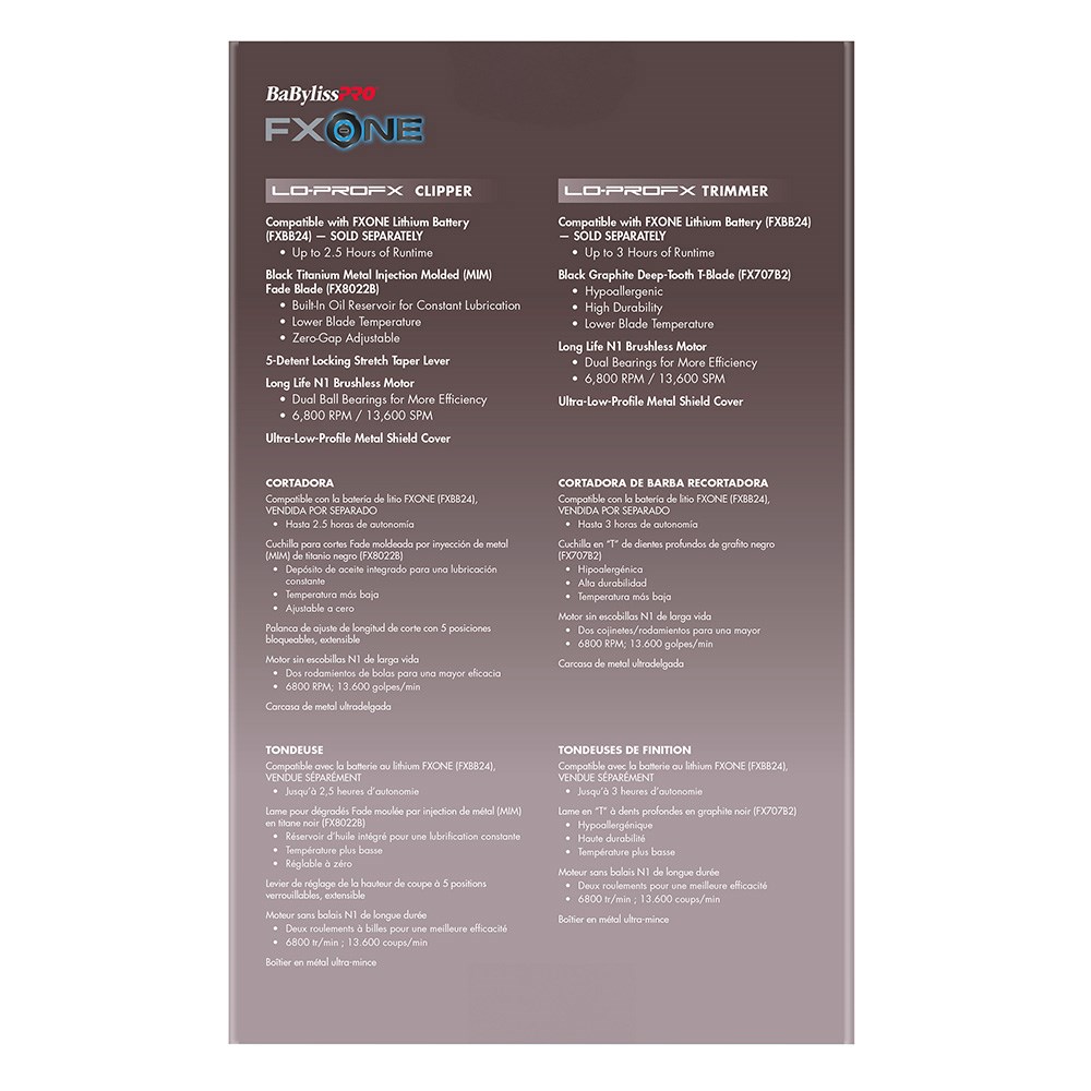 The combined might of FXONE! BaBylissPRO FXONE LoPROFX Hair Clipper and Hair Trimmer Duo in limited edition Nightfall is double the performance, double the convenience. Part of the BaBylissPRO FXONE ecosystem based on ONE battery, this duo changes the way you work. BaByliss PRO FXONE LoPROFX Hair Clipper is a high performance, ultra-low profile clipper compatible with the FXONE battery. Long-life N1 6,800 rpm brushless motor, ultra-thin black titanium Metal Injection Moulding (MIM) fade blade, zero gap adjustable and 5 detent locking stretch taper. BaBylissPRO FXONE LoPROFX Hair Trimmer is high strength with ultra-low profile and black graphite deep tooth T-blade. Both tools are ergonomic for an incredibly intuitive feel.