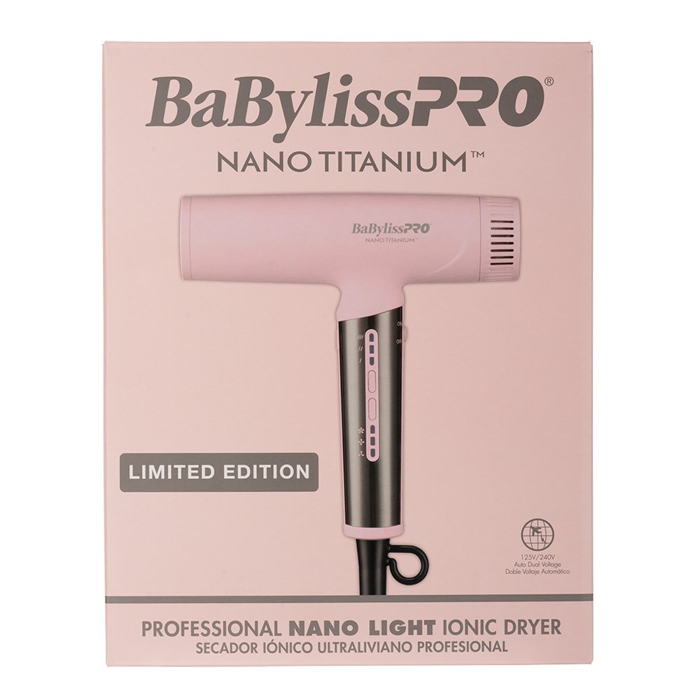 Good things come in small packages! BaBylissPRO Nano Titanium Light Iconic Hair Dryer Pink is compact, ultra-lightweight and high speed. Engineered airflow for faster drying. Ideally balanced T-shaped design weighs less than 453g and is almost the size of a smartphone. 1,400 watts of power and 9 digital heat/speed settings for versatile styling. Nano Titanium and ionic technologies ensure maximum smoothness and shine. Dual voltage enables worldwide usage – this hair dryer goes anywhere! Three innovative attachments satisfy every styling demand: cool-to-touch concentrator nozzle with air gaps for faster cooling, contoured diffuser and straightening comb with curved teeth for superior tension during styling.
