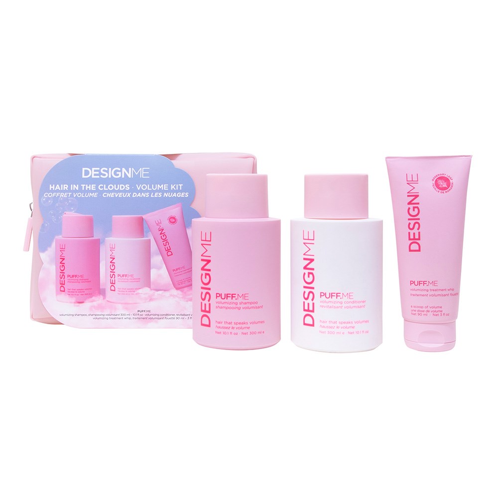 Take your hair to new heights with DESIGNME Hair in the Clouds Volume Kit. This limited-edition volumising kit delivers full-bodied lift and a silky smooth finish. Kit includes the DESIGNME Puff.ME Volumising Shampoo, Puff.ME Volumising Conditioner and Puff.ME Volumising Hair Treatment. Plump and strengthen hair for fuller-looking strands. Perfect for thin hair craving cloud-like bounce and dreamy volume. All packed up in a cute pink, reusable and water-resistant cosmetic pouch, perfect for gifting. Vegan, cruelty-free, sulphate-free, gluten-free and paraben-free.