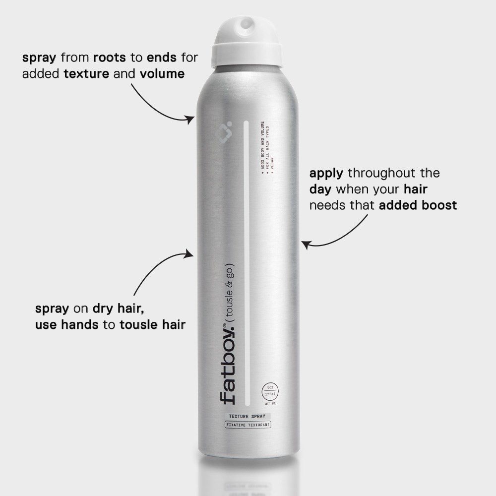With sunflower seed extract and bataua oil, Fatboy Volumising Shampoo hydrates and promotes hair fullness. Fatboy Volumising Conditioner is enriched with sweet almond oil and wheat protein to strengthen, protect against breakage and boost luminosity. Fatboy Tousle & Go Texture Spray adds volume, definition and workable hold.