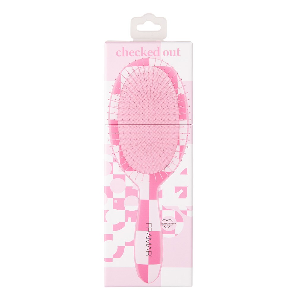 Tame your tresses in style! Framar Detangle Hair Brush Checked Out Pink is a bold blend of playful design and serious detangling power. This brush effortlessly detangles wet or dry hair with ease. Ideal for all hair types, including wigs and hair extensions. Flexible bristles deliver pain-free brushing. Not only a detangler, this brush is also great at brushing colour or toner through hair for even application or assist in styling, such as brushing out curls.
