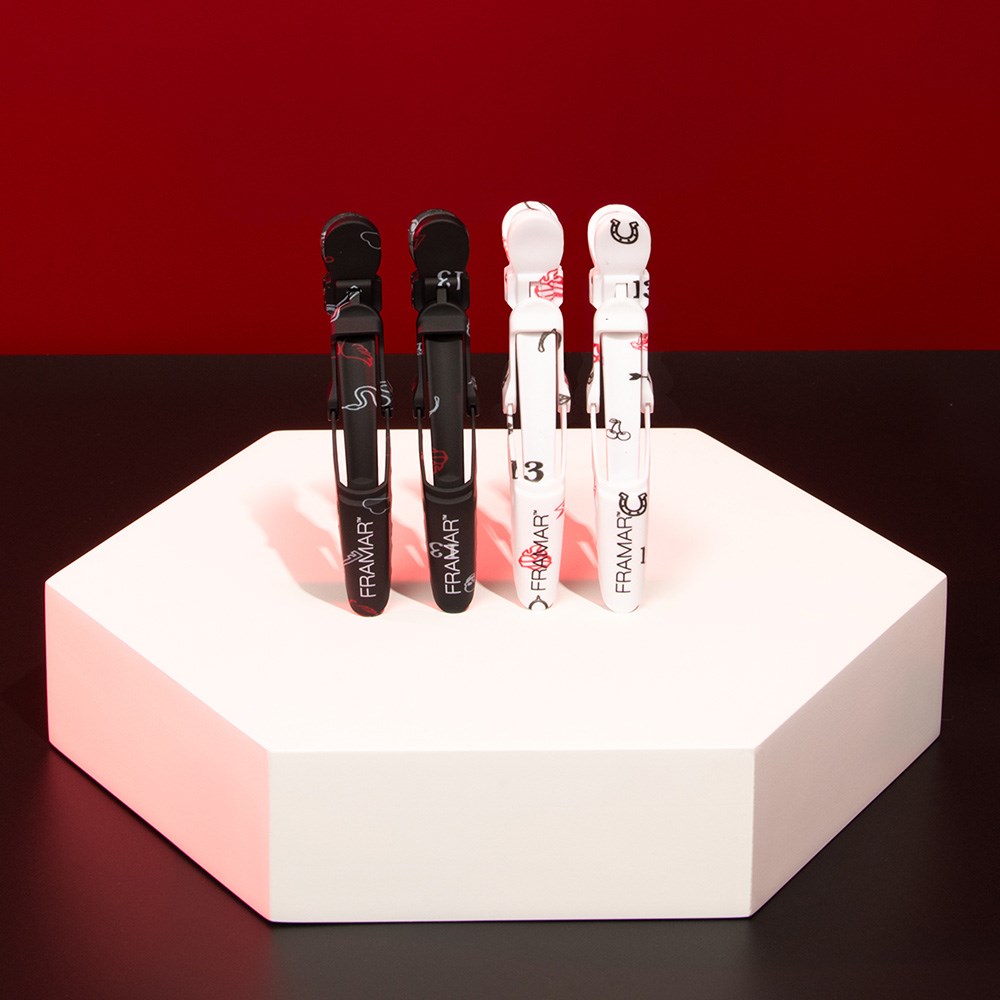 Your lucky charms! Get lucky with Framar’s good luck charm print. Framar Gator Grip Clips 4 Pack in Get Lucky effortlessly hold large sections of hair. With a wide mouth and rubberised non-slip surface, these clips are stronger than an alligator. Secures hair during colouring, styling and foiling. Industrial springs for ultimate durability. Pack of four: two black clips, two white clips.