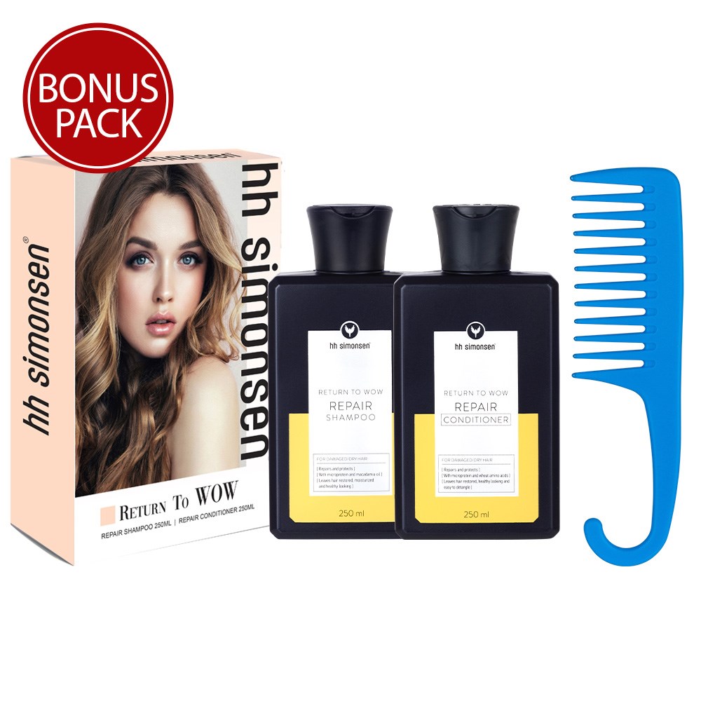 Immediate emergency help for damaged hair. HH Simonsen Return To Wow Sale Pack is powered by several keratin-rich micro-proteins to deeply penetrate the hair strand and repair hair from within. Wheat-based amino acids, macadamia oil and jojoba oil boost hair’s nourishment, vitality and strength. Hair is left detangled with improved bounce and resiliency. Gorgeous luxury for tired, over-processed hair in desperate need of repair. Bonus Premium Pin Company 999 Shower Comb gently detangles and distributes conditioner throughout hair.
