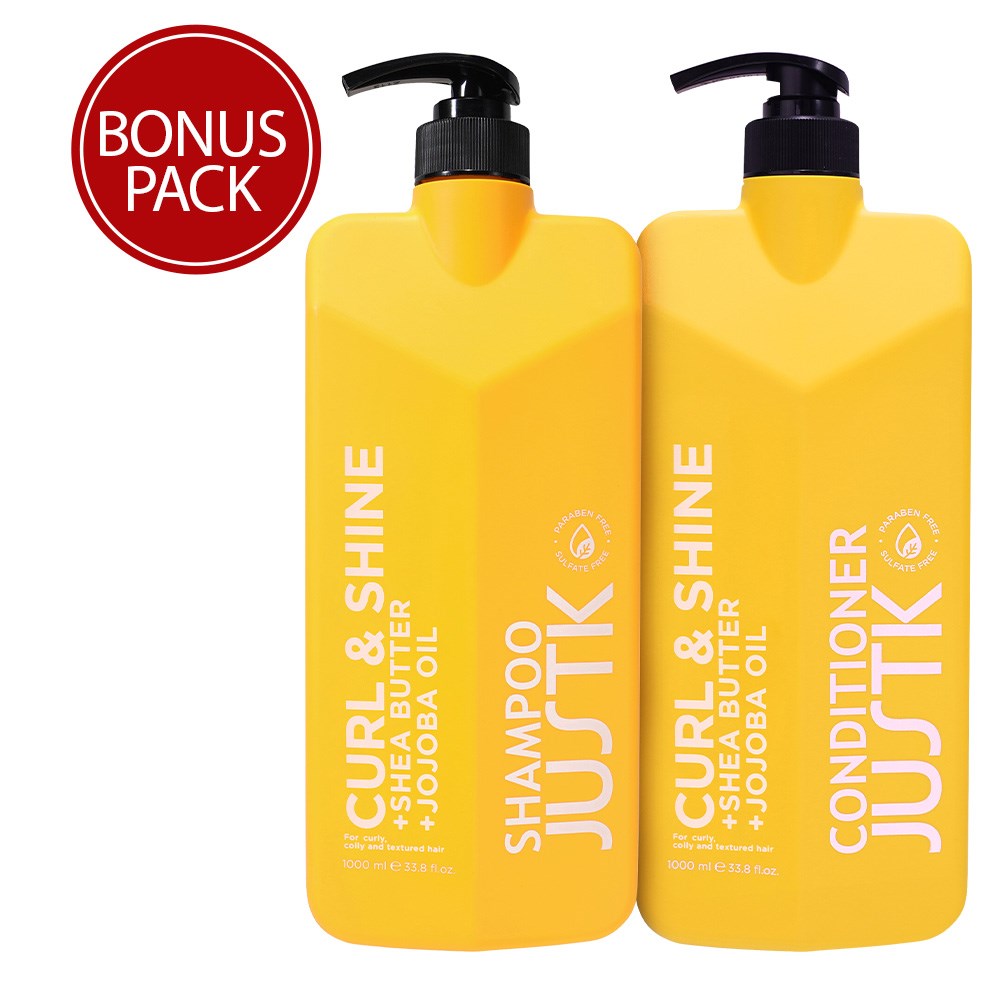 From woeful to wow, one wash at a time. Professional formulas which solve all the problems of the hair rainbow. JustK Curl & Shine Duo 1L ensures happy, bouncy curls with lovely shine. Enriched with shea butter and jojoba oil to renew, moisturise and hydrate parched curls. This 1L shampoo and conditioner duo makes amazing curls affordable!