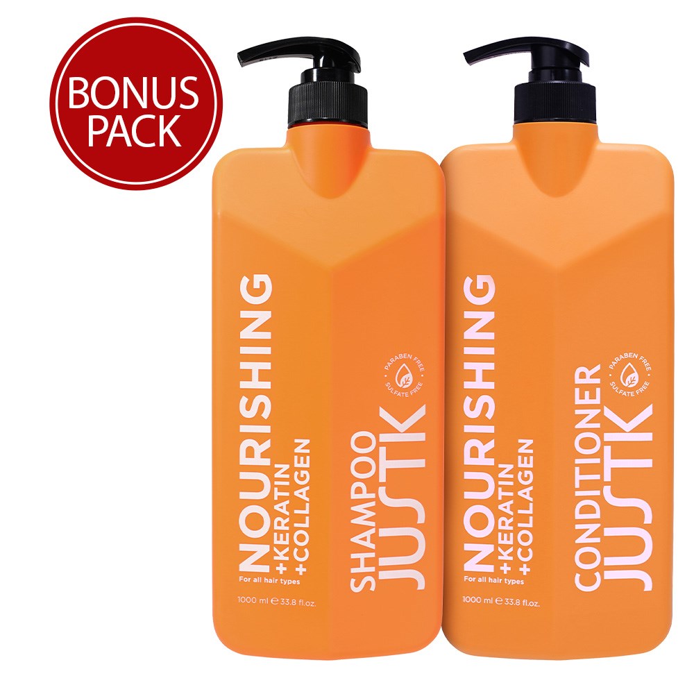 From woeful to wow, one wash at a time. Professional formulas which solve all the problems of the hair rainbow. JustK Nourishing Duo 1L ensures essential hydration and shiny smoothness. Enriched with collagen for smoother, softer hair. This 1L shampoo and conditioner duo makes beautiful shine affordable!