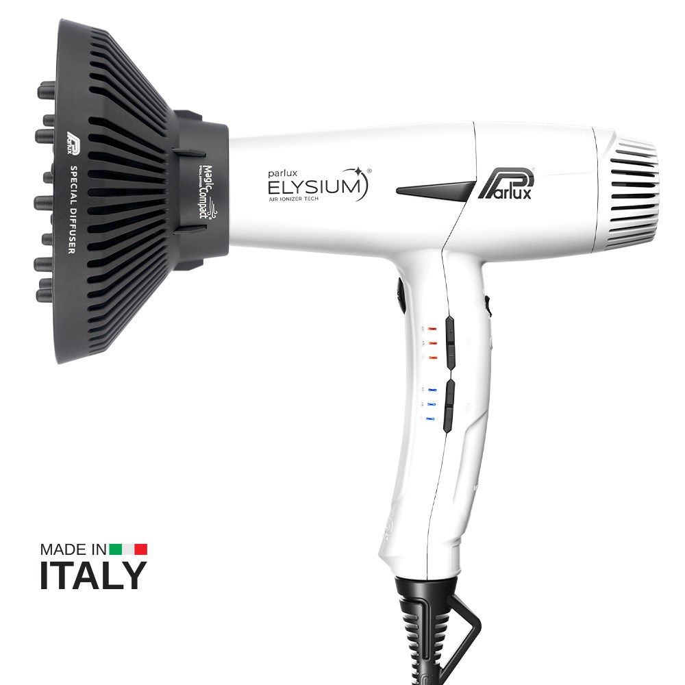 The first Parlux digital mini Hair Dryer. Designed to satisfy the demands of professionals, Parlux Elysium Hair Dryer and Diffuser White is a futuristic experience. With exceptional reliability, Parlux Elysium Hair Dryer is compact, light and powerful. Professional digital oversized mini-motor delivers a powerful 2,300 watts and 80m3/h airflow. 3 speed and 3 temperature settings for 9 versatile combinations. Air Ionizer Tech ionic technology for smooth, sleek results. Lightweight and ideally balanced with an ergonomic handle. Quick and easy cleaning with washable and replaceable sponge filter. Includes 3 concentrator nozzles, 2 of which are new AirFusion nozzles to optimise airflow for faster, more precise styling with added shine. Also includes Magic Compact Special Diffuser.