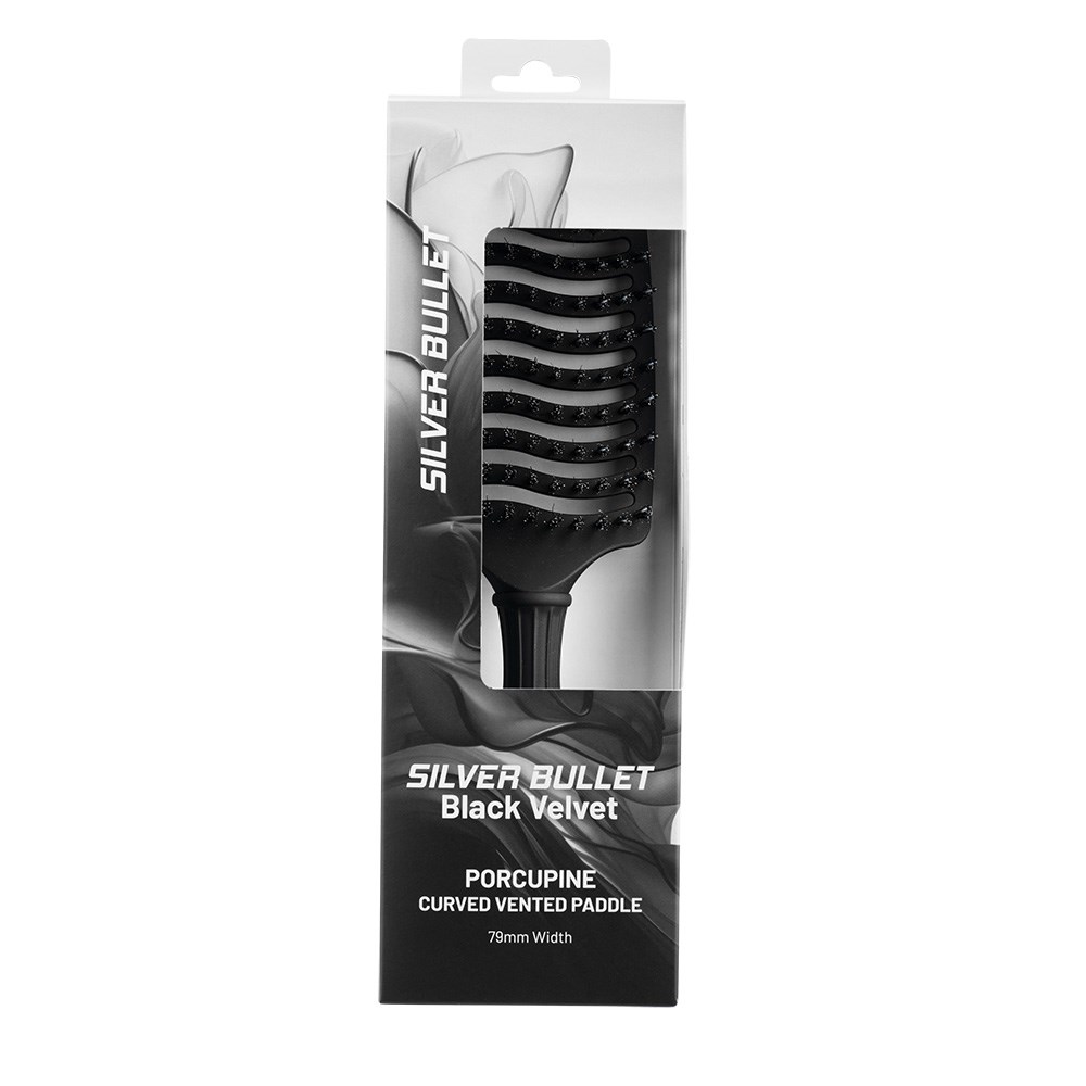 Hair which feels as smooth and soft as velvet. Silver Bullet Black Velvet Curved Vent Porcupine Paddle Hair Brush is perfect for detangling, smoothing and drying. The vented design speeds up blow-drying and styling to enhance your efficiency, while the curved head contours to the scalp for improved comfort. Nylon and boar bristles.