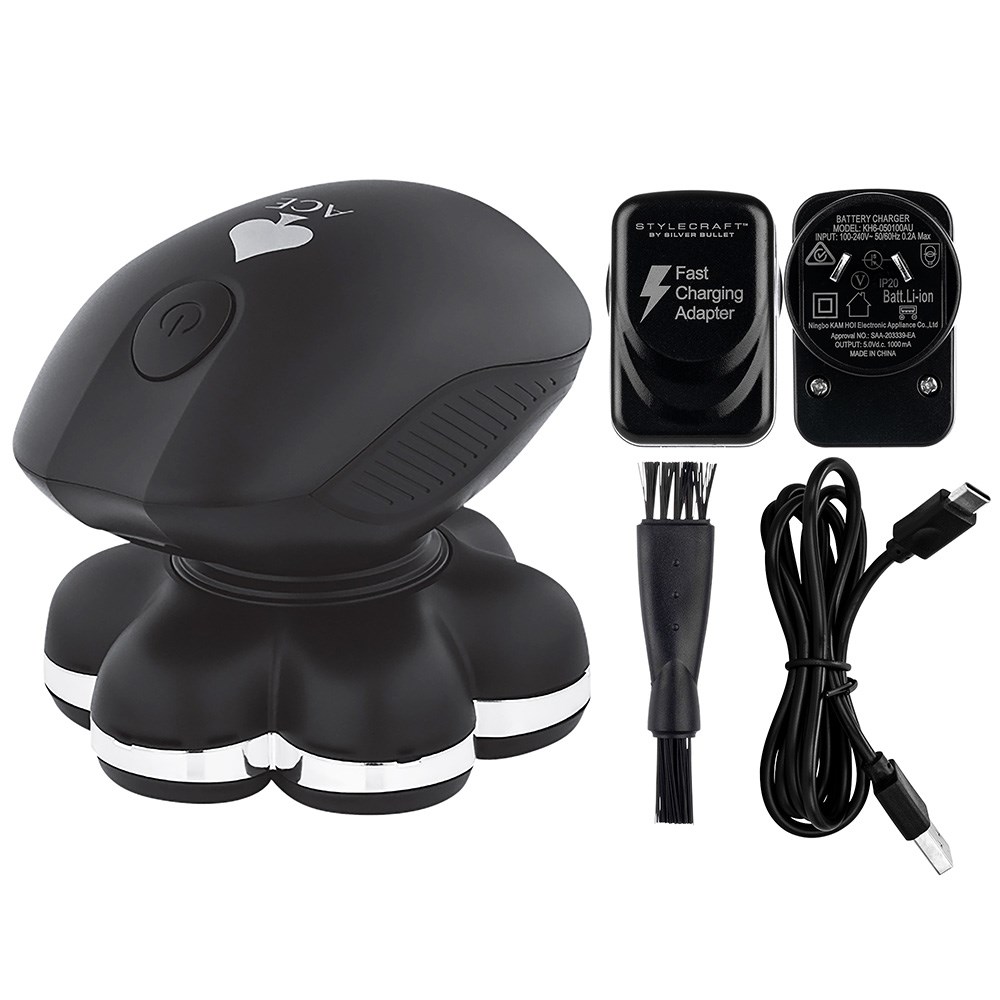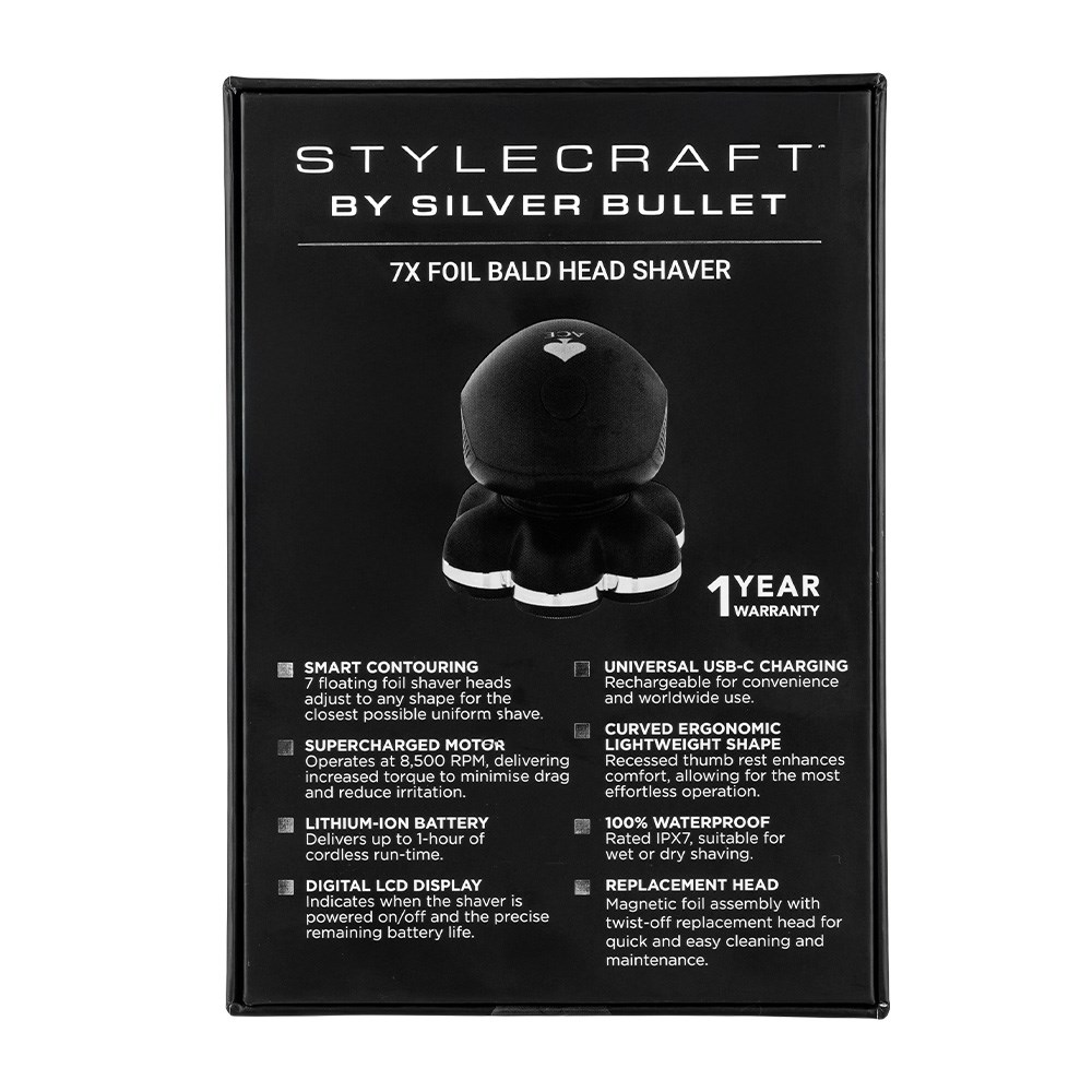 Achieve the closest possible uniform shave. StyleCraft by Silver Bullet Ace 7x Foil Bald Head Shaver features 7 floating foil shavers which adjust to any shape for ultra-smart contouring. Supercharged motor powers to 8,500 rpm, delivering increased torque to minimise drag and reduce irritation. Stainless steel flexible foil with easy-release head for quick cleaning and maintenance. Lithium-ion battery with up to 1 hour of cordless runtime. Digital LCD display indicates precise battery life. USB-C rechargeable for convenience and worldwide use. 100% waterproof for wet or dry shaving. Curved ergonomic, lightweight design for top-notch comfort.