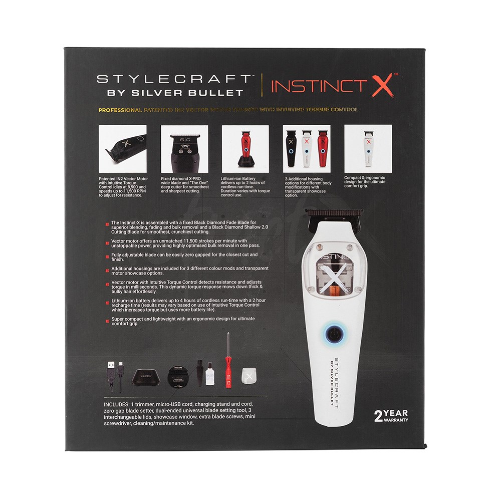 Ultra-powerful vector motor trimmer with intuitive torque control. StyleCraft by Silver Bullet Instinct X Hair Trimmer is an unbeatable combination of extreme power, innovative technology and an ergonomically designed, compact and customisable body. Instinct X detects resistance and adjusts torque in milliseconds. Dynamic torque response achieves any style with ease and precision. Patented IN2 vector motor idles at 8,500 rpm and speeds up to 11,500 rpm. Fixed Black Diamond Carbon DLC X-PRO wide blade and The One deep cutter for smoothest, sharpest cutting. Lithium-ion battery delivers up to two hours of cordless runtime. Three additional housing options for different body modifications with transparent showcase option.