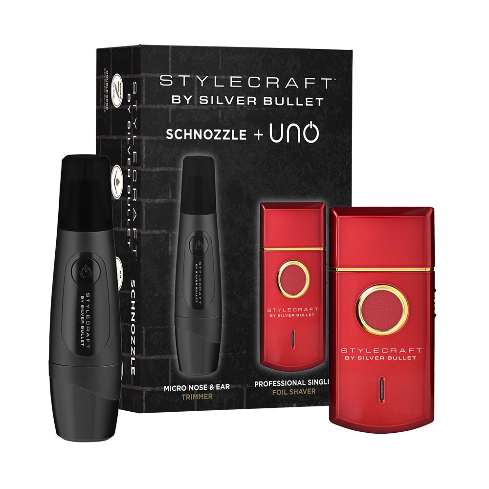 StyleCraft by Silver Bullet Schnozzle and Uno Duo supercharges nose, ear, beard, neck and face grooming. An ultra-portable, whisper quiet and powerful duo. StyleCraft by Silver Bullet and Ear Hair Trimmer is a cordless, 100% water resistant tool which quickly removes excess hair. With double-edged bevelled blades, this trimmer is great for use on nose, ear, eyebrow, beard, neck and facial hair. StyleCraft by Silver Bullet Uno Single Foil Shaver features a supercharged 9,000 rpm motor with high torque to eliminate drag. Ultra-thin gold titanium foils are hypoallergenic and super-close cutting. Lithium-ion battery for 120 minutes of cordless runtime. Lightweight, ergonomic, pocket-sized and USB rechargeable.