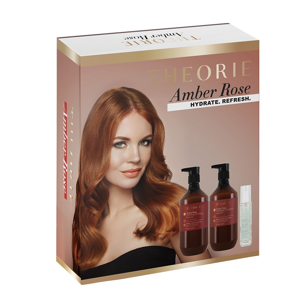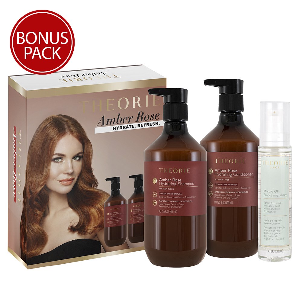 Elevate gift giving with Theorie. Theorie Amber Rose Pack includes full-sized Amber Rose Shampoo, Amber Rose Conditioner and Marula Oil Smoothing Serum for intense moisture. The perfect gift for thirsty hair.