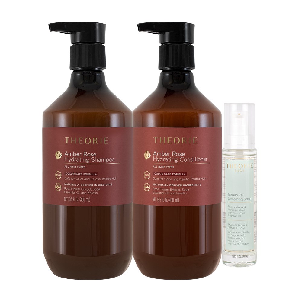 Amber Rose Shampoo richly nourishes and hydrates dry hair. Amber Rose Conditioner is brimming with emollient properties to enhance absorption, eliminate tangles and boost shine. Marula Oil Smoothing Serum is nutrient-rich to protect against thermal damage while hydrating and smoothing.