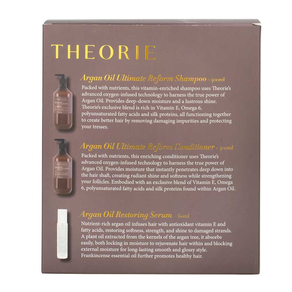To Use: Apply Theorie Argan Oil Reforming Shampoo. Lather. Rinse thoroughly. Follow with Theorie Argan Oil Ultimate Reform Conditioner, apply to mid-lengths and ends. Rinse thoroughly. Apply Theorie Argan Oil Restoring Serum to ends of damp or dry hair, dispersing lightly. Style as desired.