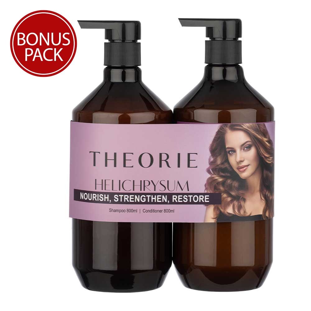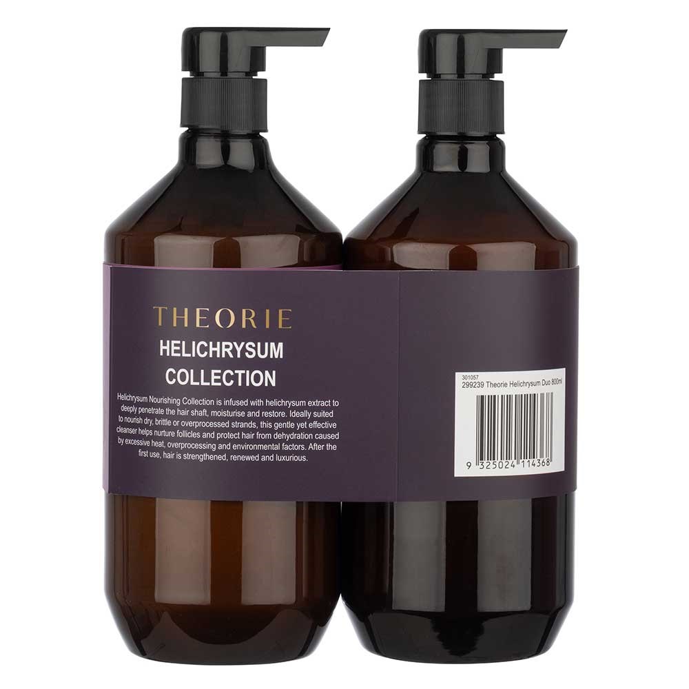 Use better products, get better hair. That’s our Theorie. Give the gift of Theorie Helichrysum Nourishing Duo 800ml, infused with helichrysum extract. Designed to deeply penetrate the hair shaft, moisturise and restore. Ideal for normal, coloured and keratin-treated hair, this gentle yet effective shampoo and conditioner protects hair whilst delivering extreme moisture and magnificent shine. No parabens, no phthalates, no animal testing.
