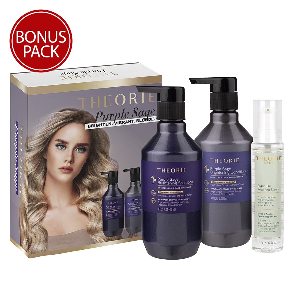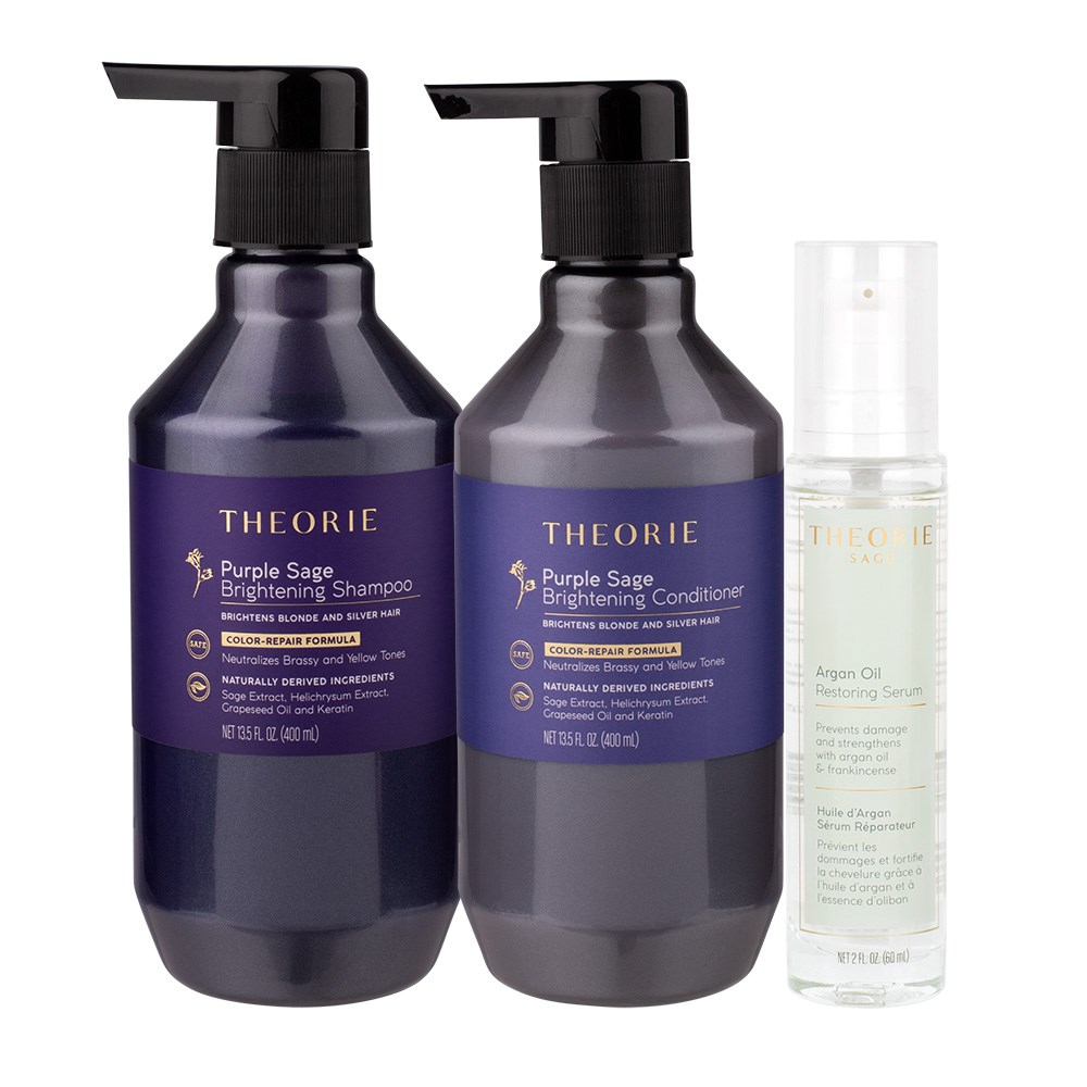 Elevate gift giving with Theorie. Theorie Purple Sage Pack includes full-sized Purple Sage Shampoo, Purple Sage Conditioner and Argan Oil Restoring Serum to vibrantly brighten and restore resilience. The perfect gift for blonde, silver and colour-treated hair.