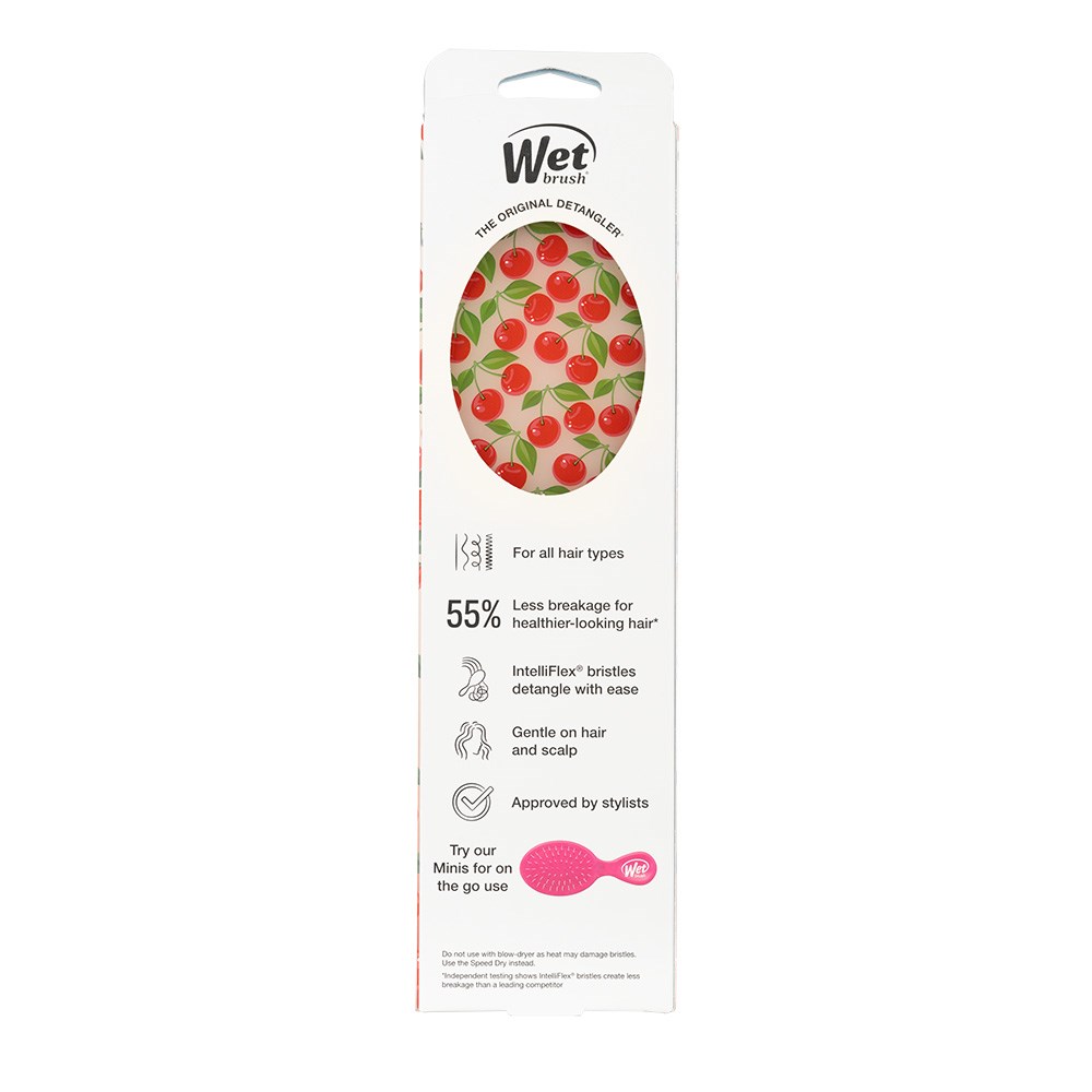 The original, award-winning brush which helps hair stay strong! WetBrush Tutti Fruitti Detangler Cherry gently loosens knots on wet or dry hair without pulling or snagging. The moment you use it, you’ll feel the difference and never want to try another detangling brush again. Exclusive, ultra-soft IntelliFlex bristles glide through tangles on all hair types with ease. Minimise pain and protect against split ends and breakage. Brush with less force so you can detangle with less damage to hair. We’re sweet on this limited edition WetBrush Detangler in Cherry!
