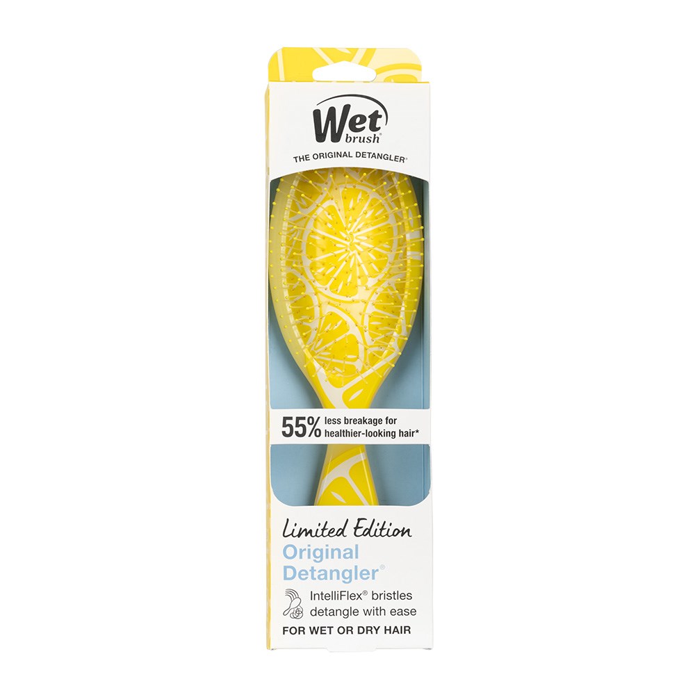 The original, award-winning brush which helps hair stay strong! WetBrush Tutti Fruitti Detangler Lemon gently loosens knots on wet or dry hair without pulling or snagging. The moment you use it, you’ll feel the difference and never want to try another detangling brush again. Exclusive, ultra-soft IntelliFlex bristles glide through tangles on all hair types with ease. Minimise pain and protect against split ends and breakage. Brush with less force so you can detangle with less damage to hair. The zest is yet to come with this limited edition WetBrush Detangler in Lemon!